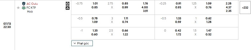 Bảng tỷ lệ kèo bóng đá trận đấu AC Oulu vs KTP Kotka