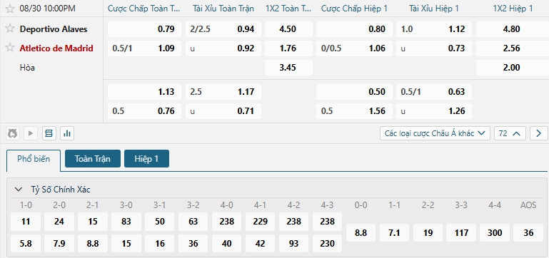 Bảng tỷ lệ kèo bóng đá trận đấu Alaves vs Atletico Madrid