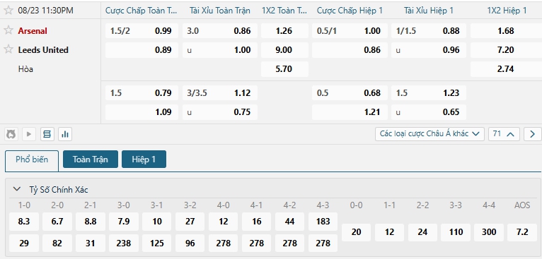 Nhà cái châu Á đang đánh giá cao khả năng chiến thắng của chủ nhà Arsenal, khi đưa ra mức chấp đang là 1.75, có được ưu thế sân nhà sở hữu thực lực vượt trội, Arsenal sẻ là đội kiểm soát thế trận và hướng đến chiến thắng cho mình, trên sân nhà của mình Arsenal thắng cả 5 lần đón tiếp Leeds, trong đó có 3 chiến thắng với tỷ số cách biệt, lựa chọn Arsenal cho kèo Châu Á.