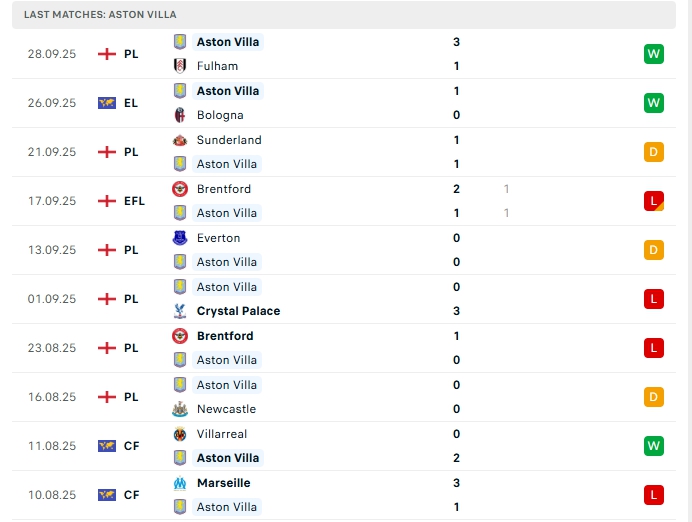 - Phong độ Aston Villa
