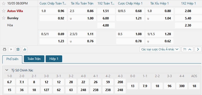 Bảng tỷ lệ kèo bóng đá trận đấu Aston Villa vs Burnley