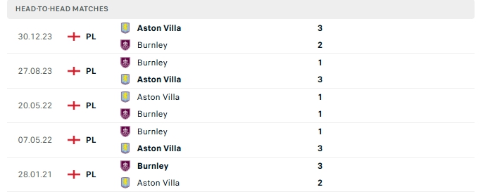 Những màn đụng độ giữa Aston Villa và Burnley thường diễn ra hấp dẫn với nhiều bàn thắng được tạo ra, cụ thể ở 4/5 lần gặp nhau gần của hai đội và lần gần nhất đón tiếp Burnley trên sân của Aston Villa khép lại trên 3 bàn.