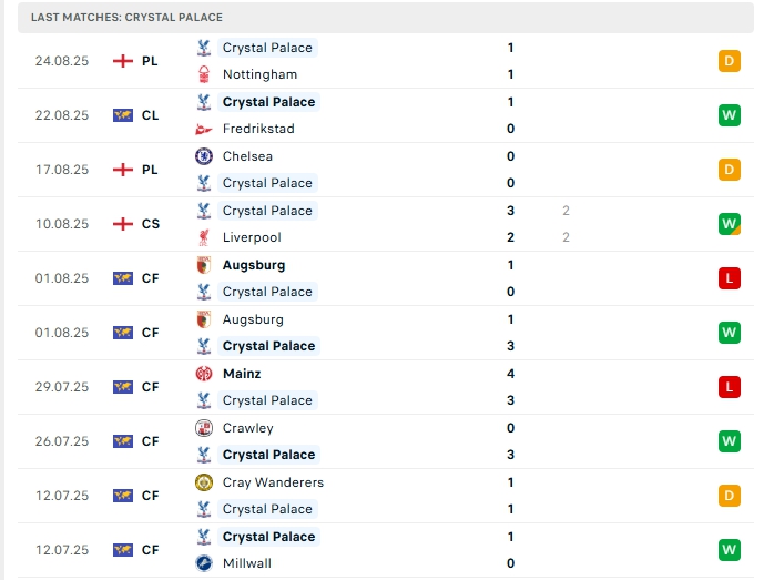 Crystal Palace ở 4 trận chính thức từ đầu mùa, họ mang về 4 bàn thắng và nhận 3 bàn thua, Crystal Palace sở hữu hàng công biết cách ghi bàn, dù vậy hàng thủ của đội bóng này không thực sự chắc chắn, đặc biệt khi xa nhà ở 3/5 trận vừa qua của Crystal Palace khép lại từ 3 bàn trở lên và 3/5 trận đấu đó họ đều để các đối thủ chọc thủng lưới.