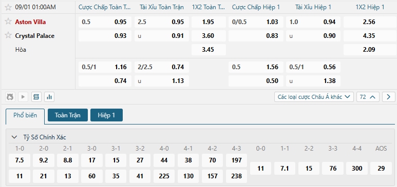 Bảng tỷ lệ kèo bóng đá trận đấu Aston Villa vs Crystal Palace