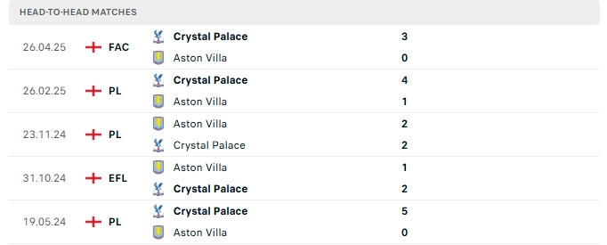 Lịch sử đối đầu của Aston Villa vs Crystal Palace