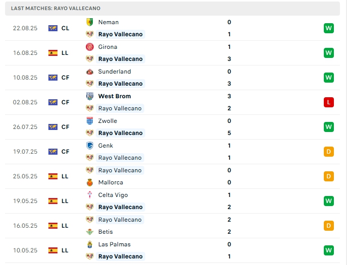 Rayo Vallecano ở vòng mở màn họ có chiến thắng ấn tượng 3-1 trước Girona, hàng công của các vị khách đang chơi tốt với 14 bàn thắng ở 5 trận gần nhất, cùng hàng thủ nhận 4 bàn thua, 4/5 trận đấu đó khép lại 90 phút từ 3 bàn trở lên, khi thi đấu xa nhà ở 4/5 trận vừa qua cũng vượt mốc trên 3 bàn.