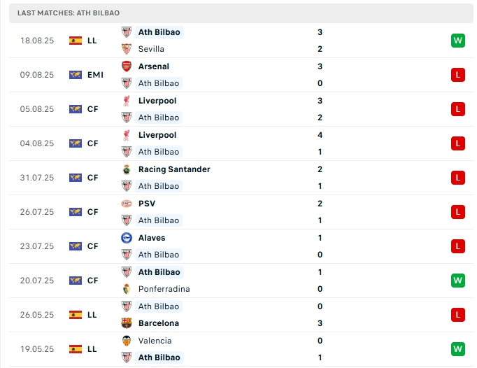 Phong độ gần đây Athletic Bilbao vs Rayo Vallecano