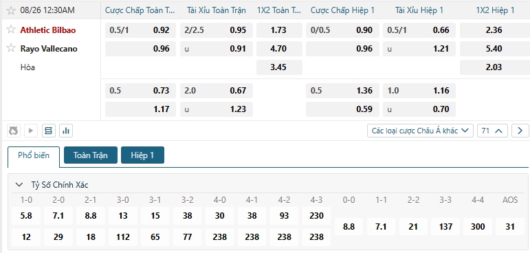 Bảng tỷ lệ kèo bóng đá trận đấu Real Athletic Bilbao vs Rayo Vallecano