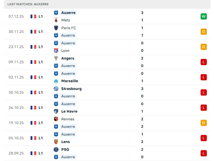 Auxerre sau 15 vòng đấu, đội bóng này mang về 3 chiến thắng, 3 hòa cùng 9 thất bại, có được 12 điểm và đang xếp vị trí thứ 16 trên BXH, một vị trí trong nhóm cầm đèn đỏ, ở vòng đấu gần nhất Auxerre có chiến thắng 3-1 trước Metz, trận thắng này chấm dứt chuỗi 9 trận không thắng trước đó, phong độ thời gian qua của Auxerre là không tốt, trên sân nhà Auxerre chỉ thắng 1, thua 3 và hòa 1 sau 5 trận.