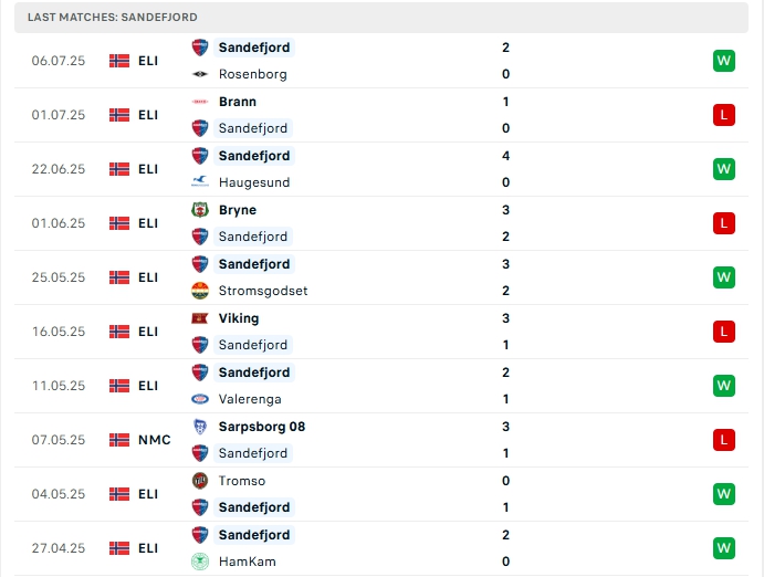 Phong độ gần đây Bodo Glimt vs Sandefjord