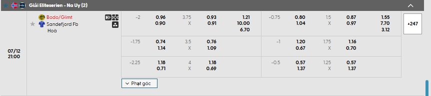 Bảng tỷ lệ kèo bóng đá trận đấu Bodo Glimt vs Sandefjord