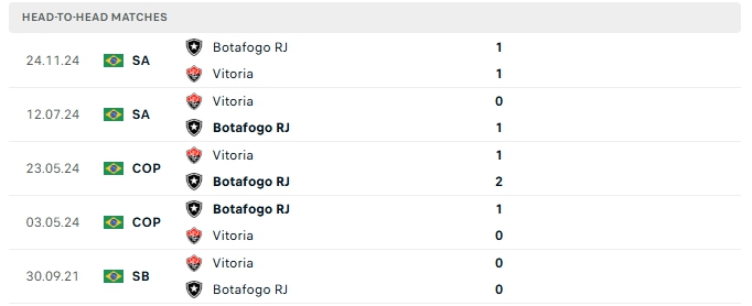 Những màn đụng độ giữa Botafogo và Vitoria/BA thường diễn ra chặt chẻ với ít bàn thắng được tạo ra, cụ thể ở 4/5 lần gặp nhau gần nhất của hai đội và 4/5 lần đón tiếp Vitoria/BA trên sân của Botafogo khép lại không quá 2 bàn.