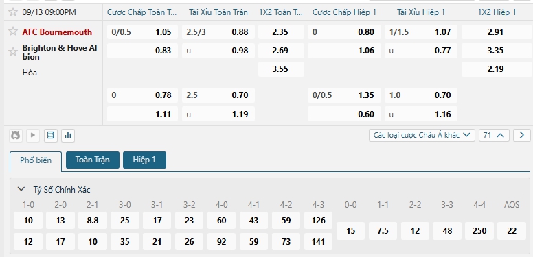 Bảng tỷ lệ kèo bóng đá trận đấu Bournemouth vs Brighton