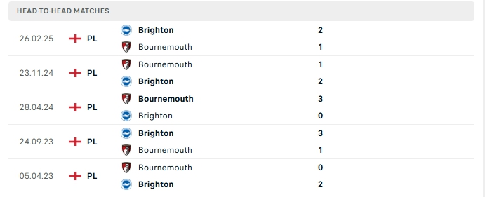 Những màn đụng độ giữa Bournemouth và Brighton thường diễn ra hấp dẫn với nhiều bàn thắng được tạo ra, cụ thể ở 4/5 lần gặp nhau gần nhất và 4/5 lần đón tiếp Brighton trên sân của Bournemouth khép lại vượt mốc trên 3 bàn.