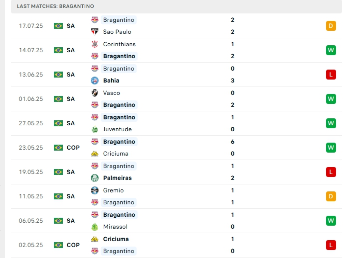 Bragantino ở trận đấu gần nhất họ có trận hòa 2-2 trước Sao Paulo, đây là trận bất bại thứ 2 liên tiếp, sau 14 lượt trận với 8 chiến thắng, 3 hòa cùng 3 thất bại, có được 27 điểm và đang xếp vị trí thứ 3 trên BXH, phong độ sân nhà của Bragantino cũng khá tốt với 4 chiến thắng, 2 hòa cùng 2 thất bại sau 8 trận đấu.