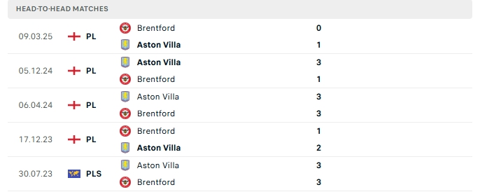 Lịch sử đối đầu của Brentford vs Aston Villa