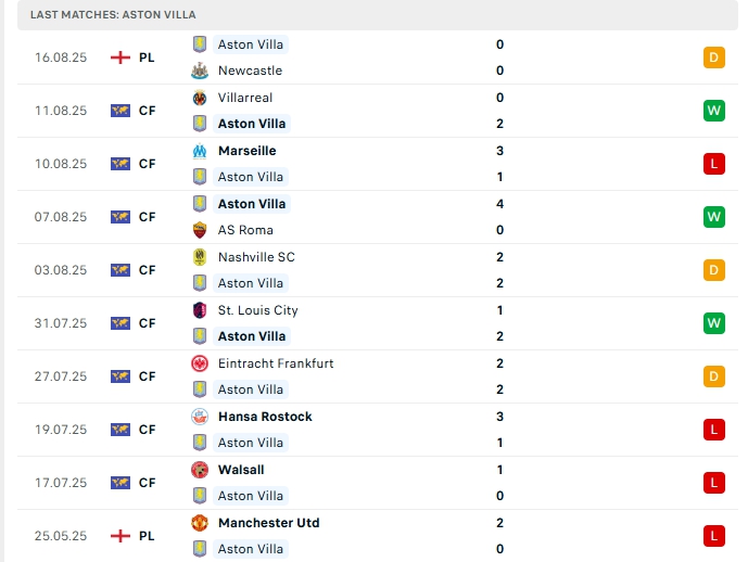 Aston Villa ở vòng mở màn họ có trận hòa 0-0 trước Newcastle, Aston Villa có màn chuẩn bị ấn tượng khi có được 8 trận đấu giao hữu, hàng công mang về 14 bàn thắng cùng hàng thủ nhận 12 bàn thua, 6/8 trận đấu đó đều khép lại từ 3 bàn thắng trở lên, và 4/5 trận xa nhà của họ cũng vượt mốc trên 3 bàn.