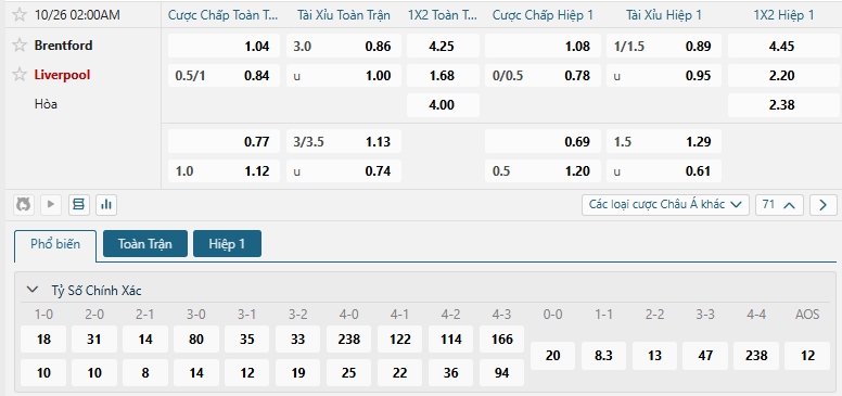 Bảng tỷ lệ kèo bóng đá trận đấu Brentford vs Liverpool