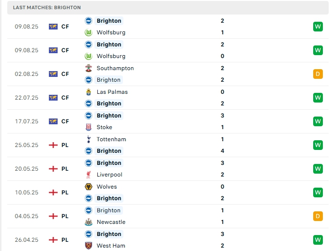 Phong độ gần đây Brighton vs Fulham