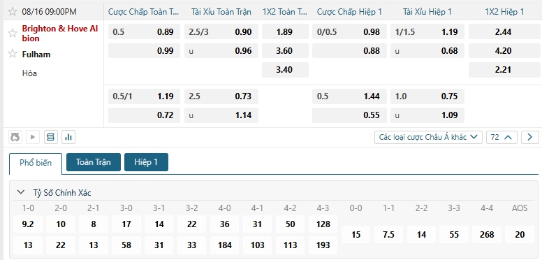Nhà cái châu Á đang đánh giá cao khả năng chiến thắng của chủ nhà Brighton là cao hơn so với Fulham, khi đưa ra mức chấp đang là 0.5, với ưu thế sân nhà, phong độ ấn tượng thời gian qua, cùng lịch sử ủng hộ thì Brighton hứa hẹn sẻ có khởi đầu như mơ và có được chiến thắng ở ngày ra quân, lựa chọn Brighton cho kèo Châu Á.