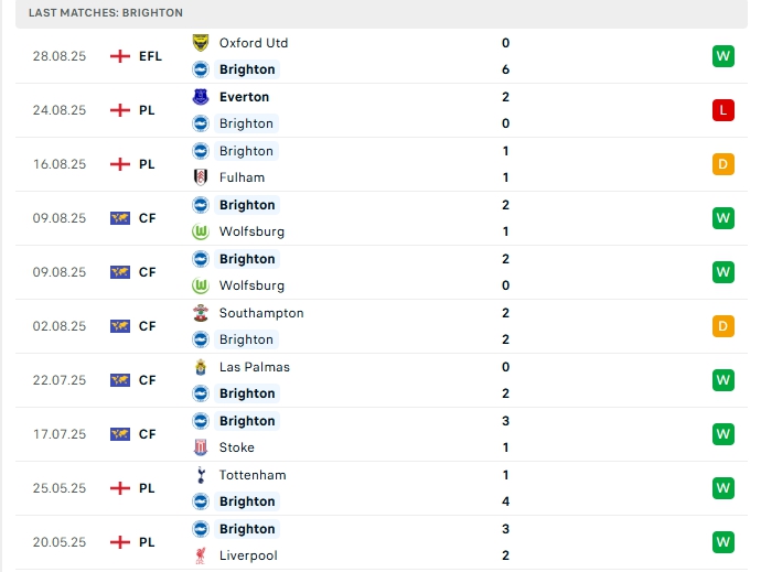 Brighton sau 2 lượt trận đầu tiên, hàng công của đội bóng này mang về 1 bàn thắng cùng hàng thủ nhận 2 bàn thua, hàng công vẫn chưa thực sự chơi tốt, dù vậy chiến thắng 6-0 ở Cúp Liên đoàn mới đây, ít nhiều đem đến nhiều sự tự tin cho hàng công của đội bóng có biệt danh chim mòng biển, 3/5 trận trên sân nhà gần nhất Brighton đều khép lại 90 phút từ 3 bàn thắng trở lên.