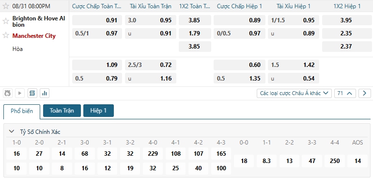Nhà cái châu Á đang đánh giá cao khả năng chiến thắng của các vị khách Man City là cao hơn nhiều, khi đưa ra mức chấp đang là 0.75, Man City sở hữu lối chơi ấn tượng, thực lực được đánh giá cao, dù Brighton sẻ gây nhiều khó khăn cho các vị khách, nhưng Man City vẫn hứa hẹn kiểm soát thế trận và có chiến thắng cho mình, Man City thường xuyên có kết quả tốt trên sân của đối thủ, lựa chọn Man City cho kèo Châu Á.
