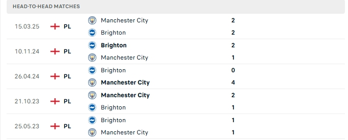 Brighton và Man City ở 5 lần gặp mặt nhau gần nhất thì có 4 lần khép lại 90 phút từ 3 bàn thắng trở lên và 5 lần đón tiếp Man City trên sân nhà Amex Stadium của Brighton thì cũng có 4 lần khép lại với kết quả tương tự.
