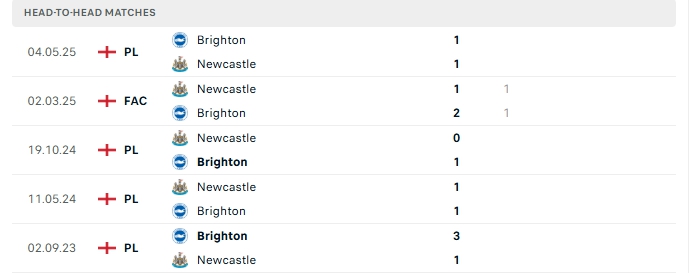 Những màn đụng độ giữa Brighton và Newcastle thường diễn ra chặt chẻ với ít bàn thắng, cụ thể ở 4/5 lần gặp nhau gần nhất và 3/5 lần đón tiếp Newcastle trên sân của Brighton khép lại không quá 2 lần lưới rung, dù Brighton chơi tấn công khá tốt nhưng Newcastle đang có hàng thủ chắc chắn mỗi khi hành quân xa nhà.