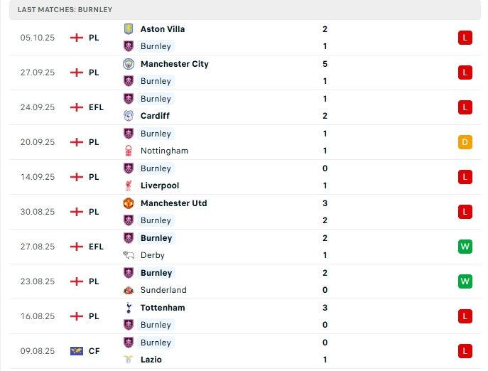 Burnley ở 7 vòng đấu đầu tiên, họ mang về 1 chiến thắng,1 hòa và 5 thất bại, họ có được 4 điểm và đang xếp vị trí 18 trên BXH, ở trận gần nhất Burnley nhận thất bại 1-2 trước Aston Villa, đây là trận thua thứ 3 liên tiếp và là trận không thắng thứ 6, trong đó có 5 thất bại, phong độ thời gian qua của Burnley là không tốt, trên sân nhà Burnley cũng thua 2 trên 3 trận gần nhất.
