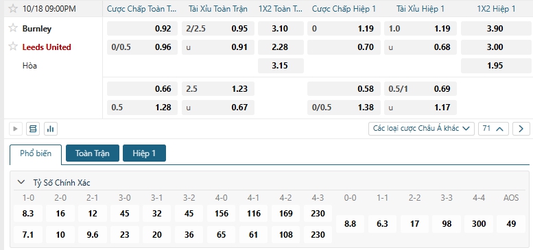 Bảng tỷ lệ kèo bóng đá trận đấu Burnley vs Leeds Utd