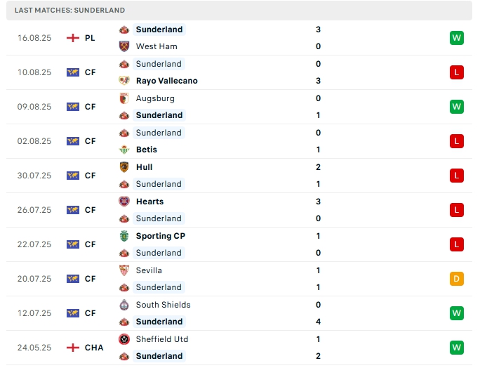 Sunderland ở vòng mở màn họ có được chiến thắng ấn tượng 3-0 trước West Ham, Sunderland có màn chuẩn bị ấn tượng khi có được 8 trận đấu giao hữu, dù thành tích mang về không tốt nhưng chiến thắng này khai màn sau khi trở lại sân chơi cao nhất nước Anh đang giúp Sunderland nhiều sự tự tin.
