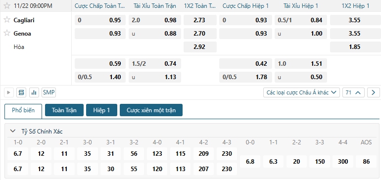 Bảng tỷ lệ kèo bóng đá trận đấu Cagliari vs Genoa