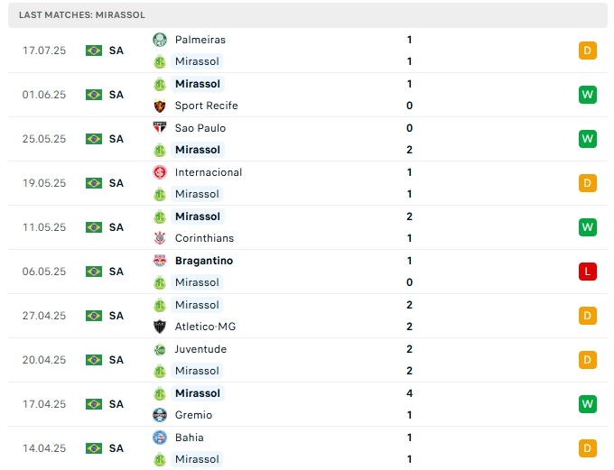 Bên kia sân, Mirassol đang trải qua chuỗi phong độ ấn tượng với 5 trận bất bại liên tiếp trong đó có 3 chiến thắng, sau 12 lượt trận Mirassol mang về 4 chiến thắng, 6 hòa và 2 thất bại, có được 18 điểm và đang xếp vị trí thứ 11 trên BXH, khi thi đấu xa nhà Mirassol có được 1 chiến thắng, 3 hòa cùng 1 thất bại ở 5 trận gần nhất.