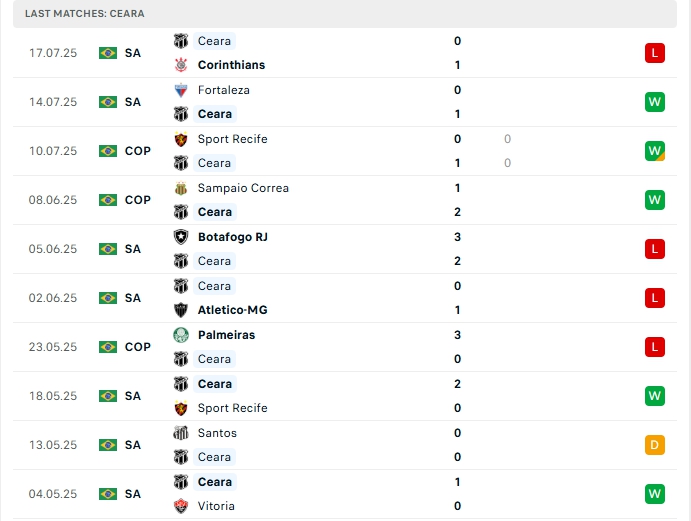 Ceara sau 13 trận đấu họ mang về 14 bàn thắng cùng với hàng thủ nhận 12 bàn thua, 3/5 trận vừa qua của Ceara khép lại 90 phút không quá 2 bàn thắng, trên sân nhà của mình ở 5 trận gần nhất thì cả 5 trận không vượt mốc quá 2 bàn, lối chơi của Ceara thiên về phòng ngự nên những trận đấu của họ thường diễn ra không quá hấp dẫn.