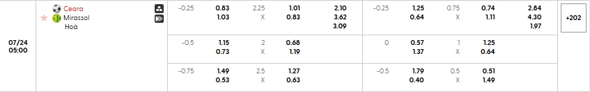Bảng tỷ lệ kèo bóng đá trận đấu Ceara vs Mirassol