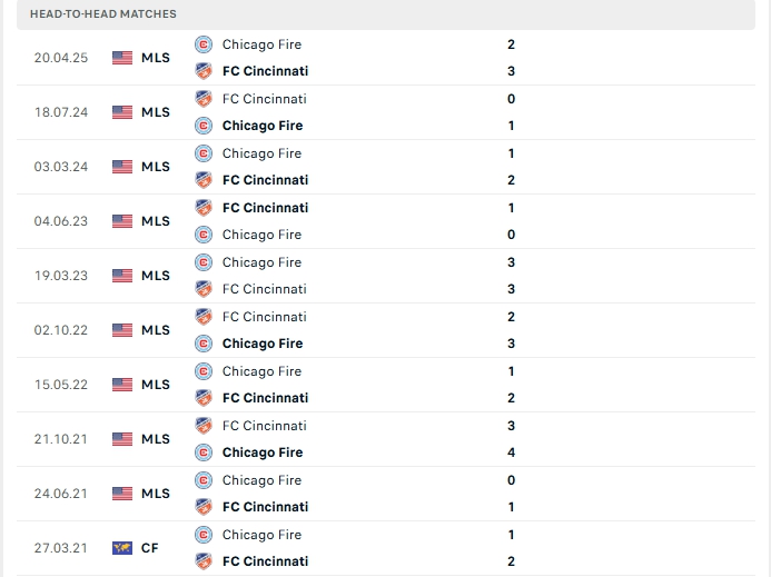 Lịch sử đối đầu của Cincinnati vs Chicago Fire