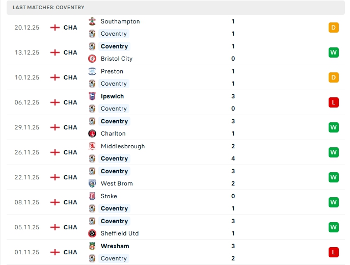 Coventry sau 22 trận đấu, đội bóng này mang về 14 chiến thắng, 6 hòa và nhận 2 thất bại, có được 48 điểm và đang xếp vị trí dẫn đầu trên BXH, ở vòng đấu gần nhất Coventry có trận hòa 1-1 trước Southampton, đây là trận bất bại thứ 3 liên tiếp của họ, phong độ trên sân nhà của Coventry là cực kỳ ấn tượng với chuỗi 13 trận bất bại liên tiếp trong đó có 9 chiến thắng và 4 hòa, Coventry đang duy trì chuỗi 7 trận thắng liên tiếp.