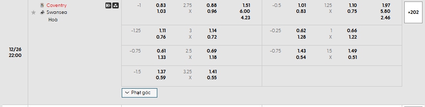Bảng tỷ lệ kèo bóng đá trận đấu Coventry vs Swansea City