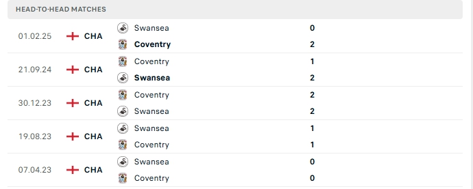 Những màn đụng độ giữa Coventry và Swansea City thường diễn ra hấp dẫn với nhiều bàn thắng được tạo ra, cụ thể ở 2/3 lần gặp nhau gần nhất của hai đội và 4/5 lần đón tiếp Swansea City trên sân của Coventry  khép lại trên 3 bàn thắng.