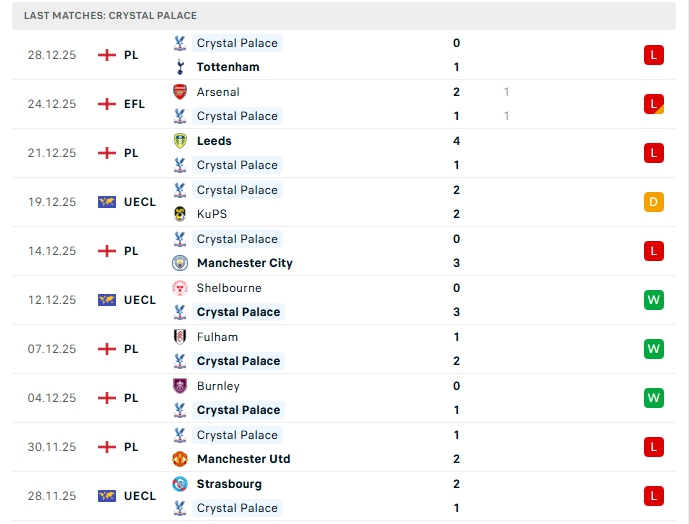 Crystal Palace sau 18 trận đấu họ mang về 7 chiến thắng, 5 hòa cùng 6 thất bại, có được 26 điểm và đang xếp vị trí thứ 9 trên BXH, ở vòng đấu gần nhất Crystal Palace nhận thất bại 0-1 trước Tottenham, đây là thất bại thứ 3 liên tiếp, và là trận không thắng thứ 5 liên tiếp, phong độ thời gian qua cùa Crystal Palace là không tốt, trên sân nhà đội bóng này cũng đang chơi tệ khi thua 3 và hòa 2 sau 5 trận đấu.