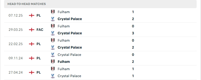 Lịch sử đối đầu của Crystal Palace vs Fulham