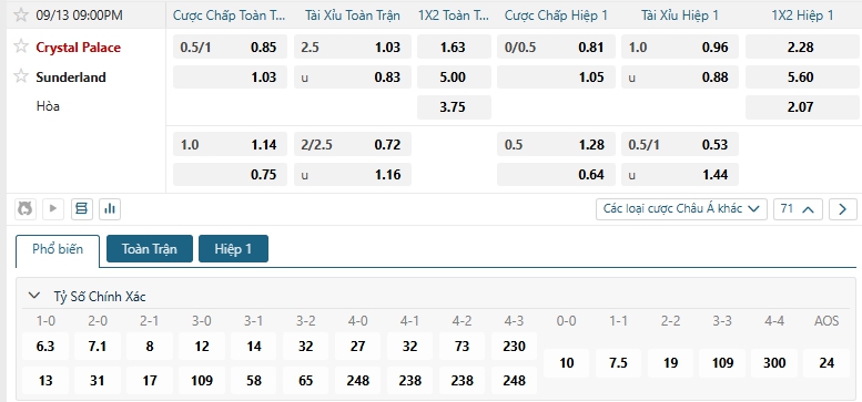 Bảng tỷ lệ kèo bóng đá trận đấu Crystal Palace vs Sunderland