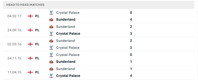 Những màn đụng độ giữa Crystal Palace và Sunderland thường diễn ra hấp dẫn với nhiều bàn thắng được tạo ra, cụ thể ở 4/5 lần gặp nhau gần nhất và 3/5 lần đón tiếp Sunderland trên sân của Crystal Palace khép lại vượt mốc trên 3 bàn.