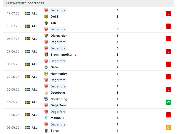 Degerfors sau 16 trận đấu hàng công mang về 18 bàn thắng cùng hàng thủ chơi tệ khi nhận đến 36 bàn thua, việc hàng thủ thi đấu thiếu chắc chắn khiến Degerfors đang gặp nhiều khó khăn, 5 trận vừa qua của họ khép lại 90 phút từ 3 bàn trở lên, cả 5 trận trên sân nhà của Degerfors khép lại trên 3 bàn thắng được ghi.