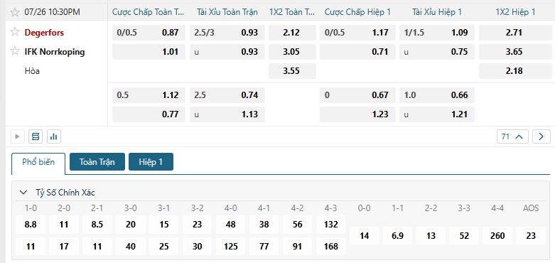 Bảng tỷ lệ kèo bóng đá trận đấu Degerfors IF vs Norrkoping