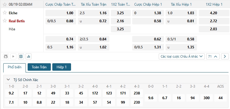 Nhà cái châu Á đang đánh giá cao khả năng chiến thắng của các vị khách Betis là cao hơn so với chủ nhà Elche, khi đưa ra mức chấp đang là 0.25, Elche dù có được ưu thế sân nhà nhưng họ bị đánh giá thấp khi sở hữu thực lực kém hơn, dù sẻ gây nhiều khó khăn cho Betis, nhưng khả năng có điểm số là không quá cao, Betis với kinh nghiệm và bản lĩnh của mình sẻ có một chiến thắng ở ngày khai màn, lựa chọn Betis cho kèo Châu Á.