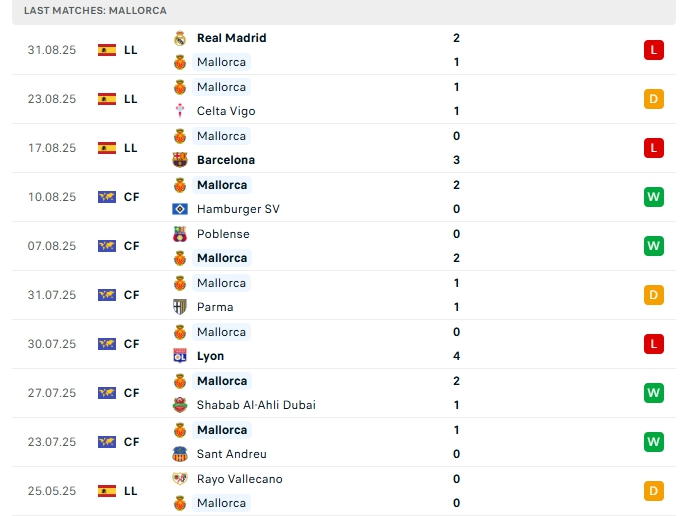 Bên kia sân, Mallorca đang có khởi đầu không tốt ở mùa giải năm nay, ở ngày ra quân họ nhận thất bại 0-3 trước Barcelona, sau đó đội bóng này lại chỉ có trận hòa trước Celta Vigo và gần nhất lại là thất bại trước Real Madrid, với chỉ 1 điểm có được sau 3 lượt trận thì Mallorca đang xếp vị trí thứ 18 trên BXH, phong độ thời gian qua của Mallorca là không tốt khi thua 2 và hòa 1 ở 3 trận, khi thi đấu xa nhà Mallorca cũng chỉ thắng 1, hòa 1 và thua 3 ở 5 trận.