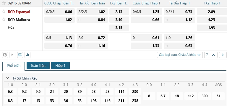 Nhà cái châu Âu đang đánh giá cao khả năng chiến thắng của Espanyol là cao hơn nhiều so với đối thủ khi đưa ra mức tỷ lệ là 2.13 và các cầu thủ khách là Mallorca là 3.40, với ưu thế sân nhà Espanyol được đánh giá cao, họ có phong độ tốt cùng lịch sử đối đầu ấn tượng khi thắng 4 và hòa 1 trong 5 lần đón tiếp đối thủ, lựa chọn Espanyol cho kèo Châu Âu.