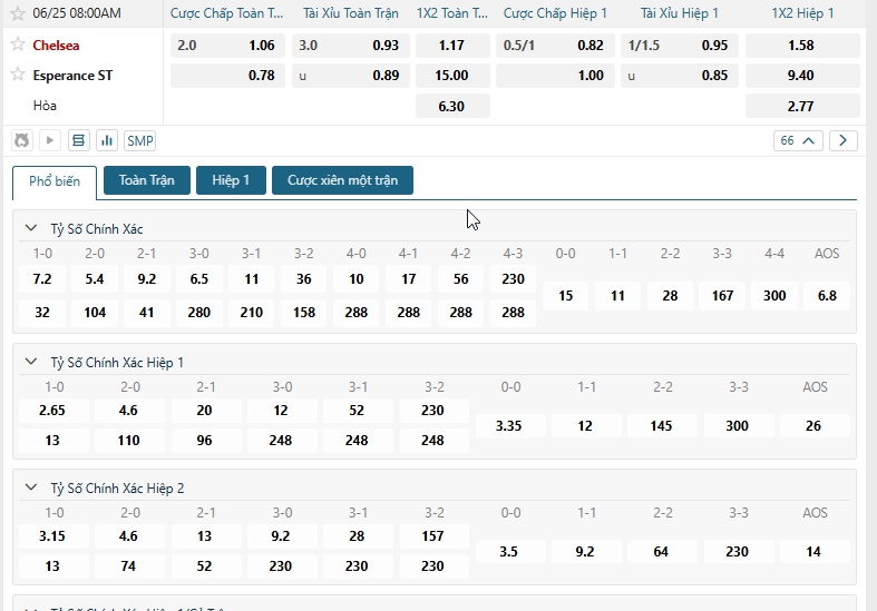 Bảng tỷ lệ kèo bóng đá trận đấu Esperanse ST vs Chelsea