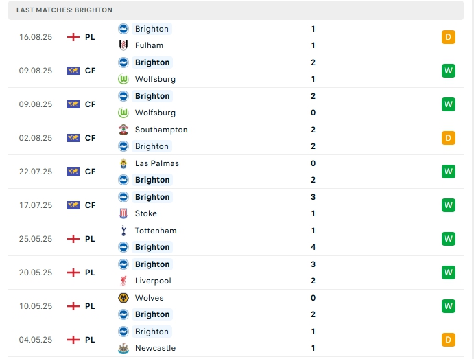 Brighton ở vòng mở màn họ có trận hòa 0-0 trước Fulham, hàng công của Brighton mang về 9 bàn thắng sau 5 trận vừa qua, bên cạnh hàng thủ khá chắc chắn khi chỉ nhận 4 bàn thua, 3/5 trận đấu đó khép lại 90 phút không quá 2 bàn, khi thi đấu xa nhà ở 2 trận giao hữu gần nhất hàng thủ của Brighton cũng chơi khá tốt.